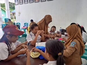 Wajah-wajah ceria terlihat di Perpustakaan Desa Lolong. Anak-anak Sekolah Dasar tampak antusias mengikuti pelatihan membuat bros dari kain perca. Dengan bimbingan Ibu Hartati, mereka belajar memotong, menjahit, dan merangkai kain perca menjadi bros-bros cantik.