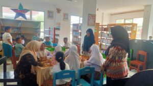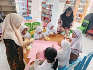 Para pengunjung anak-anak dengan senang hati mengikuti kegiatan perdana pada layanan baca anak di tahun 2025, mereka di latih membuat tas berbahan dasar karton.